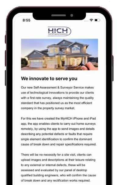MyHICH enables you to conduct property surveys remotely using our advanced mobile app. Simply upload photos and property details through the app, choose the relevant survey option, and our AI-powered system, supported by expert reviewers, analyses the information. Within 24 hours, you'll receive a comprehensive and qualified survey report—no site visit required.